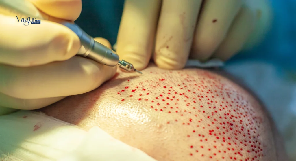 FUE uses a micro punch to extract individual follicles, leaving tiny dot scars. It’s less invasive and has faster healing, making it the most popular option today.