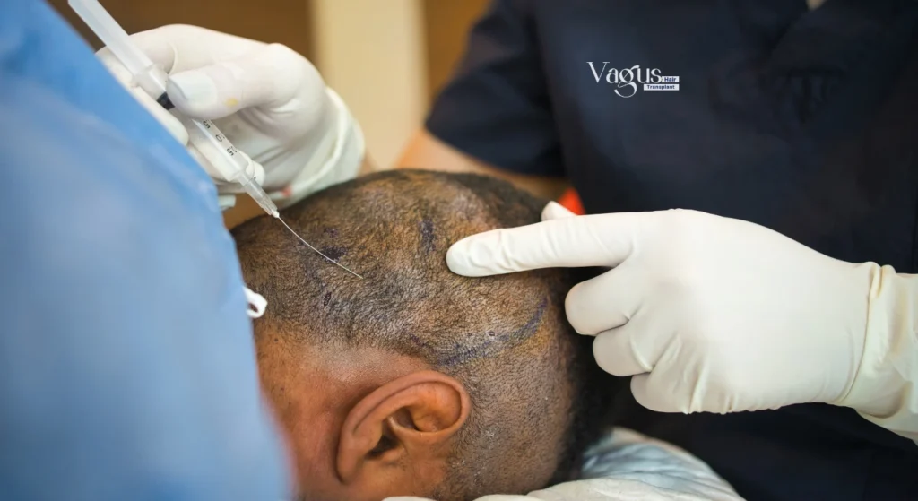 Before the FUE hair restoration technique can begin, the scalp is thoroughly cleaned and sterilized to minimize the risk of infection. Local anesthesia is then applied to numb both the donor and recipient areas.