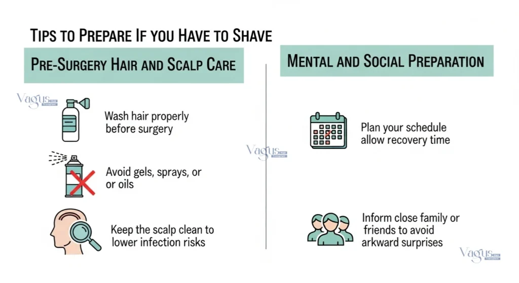 | Easier post-op care – Cleaning, applying medication, and monitoring healing are simpler on a shaved scalp. | Initial shock for family or colleagues – Some people worry about reactions from others after surgery. |